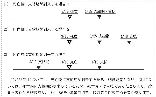 なお、死亡時までに支給期の到来している給与等については、「給与所得の源泉徴収票」の「支払金額」欄に含める必要があります(この分も含め、年末調整を行います。)。