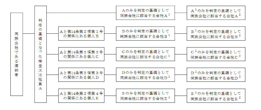 4 令第14条第2項第7号かっこ書《無償又は著しく低額の譲渡の範囲等》の「同族会社に該当する他の会社」とは、上図のA1、B1、C1、D1及びE1をいう。