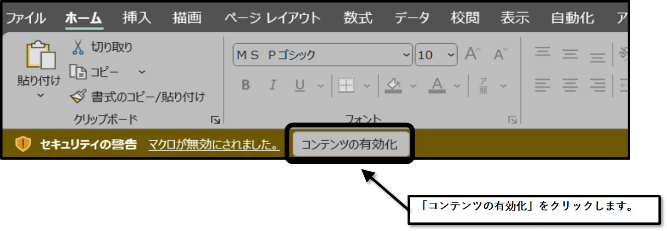 ※開いた後、画面上部に「セキュリティの警告」が表示された場合は、「コンテンツの有効化」をクリックしてください。