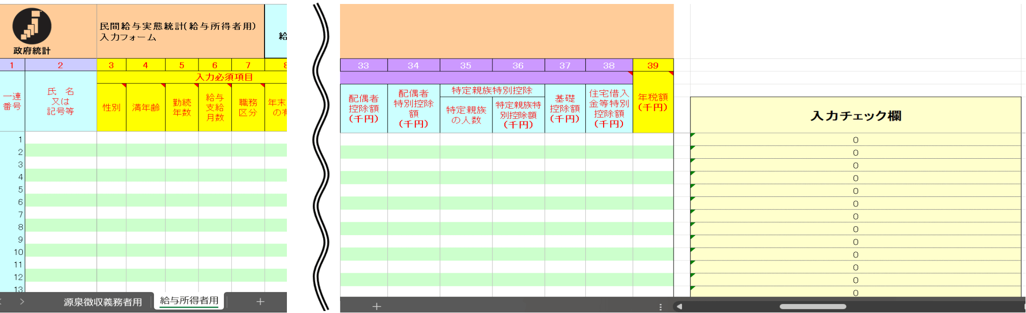 ダウンロードしたファイルを開くと「源泉徴収義務者用」と「給与所得者用」の2枚のシートがあります。