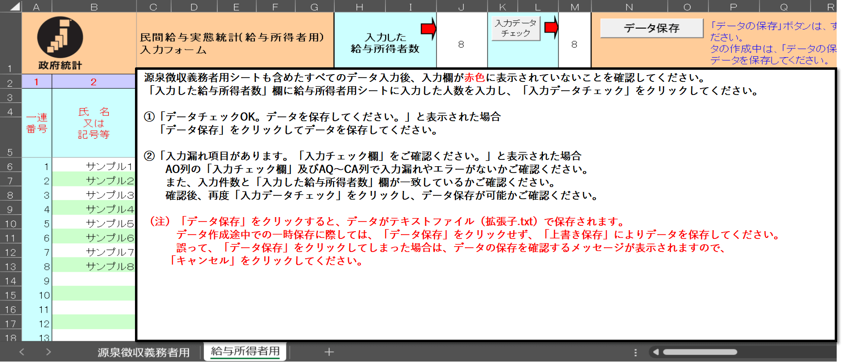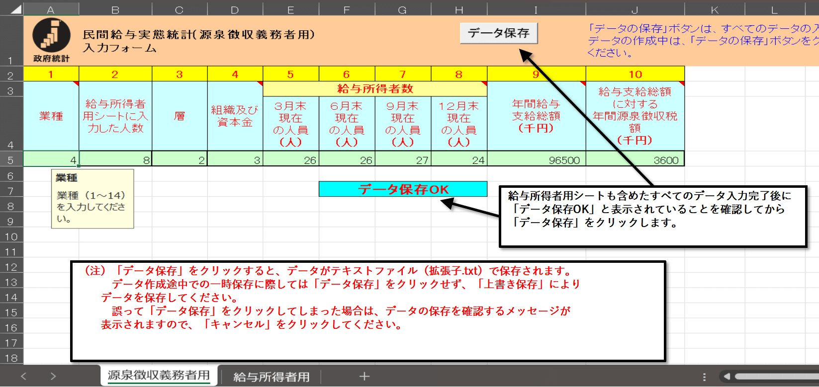 ※「データ保存」をクリックすると、給与所得者用データも併せて作成されますので、「データ保存」は民間給与実態統計調査票(給与所得者用)の入力が終了してからクリックしてください。