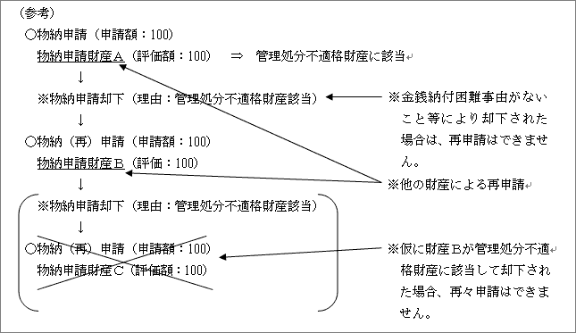 (注) これまでの管理処分不適当財産に対する変更要求の規定では、変更要求を行う回数について制限が設けられていませんでした、今回の改正では、管理処分不適格財産等が却下された場合は、1回に限り他の財産による再申請が認められることとなったものです。